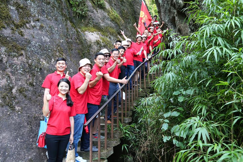 勇攀天游峰活動中,大家熱情高漲,一起穿行在綠樹掩映的山徑中,且行且欣賞如畫風景,勇攀陡峭石階,大家互相鼓勁,相互加油,攜手向著天游峰頂進發,充分展示出了天馬人敢于拼搏,“團結、務實、創新、堅韌”的企業精神。經過大家不懈的努力,當所有身著鮮艷的紅色衣服的天馬人在天游峰頂的石碑旁齊聲高喊“天馬必勝”時,激情洋溢的天馬人儼然成了武夷山頂紅紅火火的風景線。
